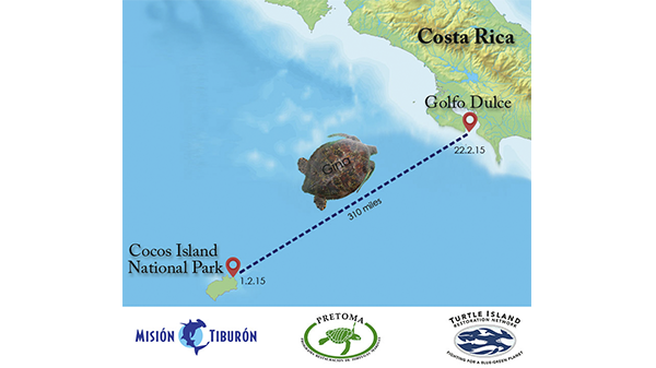 Joven tortuga verde (Chelonia mydas) migra más de 500km de la Isla del Coco hasta Golfo Dulce.